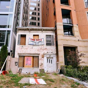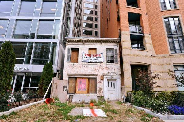 尽管周围的房子都拆除了,Mary cook也不愿卖掉她的房子。现在这栋小楼被夹在了两栋高楼之间,看起来像个凹字。