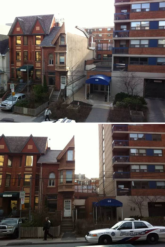 加拿大多伦多的这位房主同样不愿出售他的复式住宅,于是开发商只好把它砍成了两半……看起来有点瘆的慌~