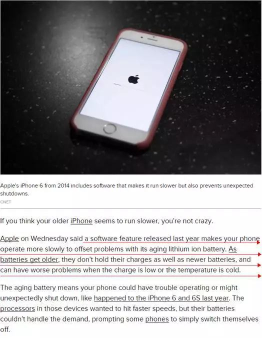 CNET报道称,苹果公司在声明中表示,随着手机电池的老化,它们的供电能力大不如前,如果供电量不能满足手机处理器所需电量或者天气很冷,苹果手机会自动关机,这会对手机产生严重影响。去年iPhone 6和iPhone 6S等机型经常自动关机。因此,苹果公司去年发布的iOS 10.2.1系统对电池的供电模式进行了调整,通过减缓手机的反应速度来防止手机突然关机。iOS 10.2.1系统适用于iPhone 6、6 Plus、6S、6S Plus和SE机型。iOS 11.2系统将这一模式扩展到了iPhone 7和 7 Plus等机型。