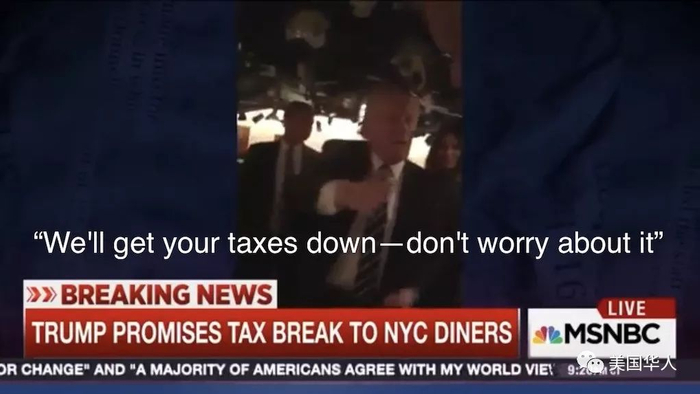 在曼哈顿一个牛排屋举办的募捐晚餐上,特朗普对共进晚餐的富人们承诺:“我们一定会把你们的税降下来的—别担心”。