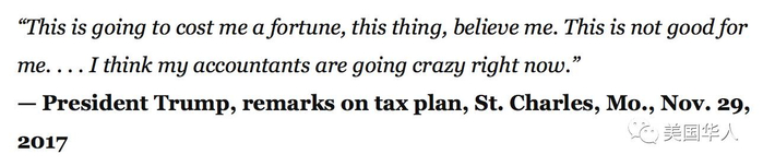 还在今年9月份时,特朗普总统就曾两次对记者们说,这个税改对我不利。现在,他更是加倍地夸张,就在不到一个月前的11月29日,特朗普在蒙大拿州圣查尔斯市的讲话中说:“这个税改将会让我损失一大笔钱。这个对我是不利的。。。。。。。我想我的会计师现在正愁得要发疯了。”还说,“believe me(相信我)!”但他又说他不在乎,因为他现在是总统了,这是一个更高的(道德)责任。