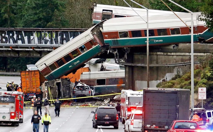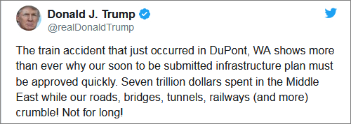 ▲ 就在特朗普新报告发布当天,美国国家铁路公司的一列客运火车在华盛顿州皮尔斯县脱轨,造成至少6人死亡、77人受伤。特朗普随即祭出“推特治国”大法,“我们把7万亿美元花在了中东地区,而国内的道路、桥梁、铁路、隧道却在崩塌。不能再这样了”。