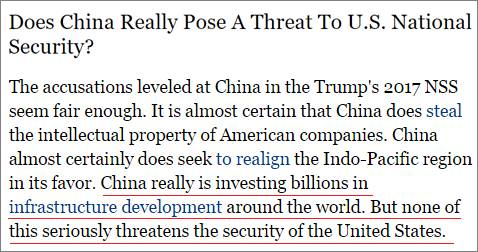 关于中国“战略对手”的定性,并未在美国掀起多大波澜。《福布斯》杂志网站19日撰文指出:“中国的确在全球投资数十亿美元的基础设施建设,但是这些对美国安全并不构成严重威胁。中国一再强调在国际事务中与美国合作的愿望,希望在美国主导下的世界体系中赢得成功。”▼