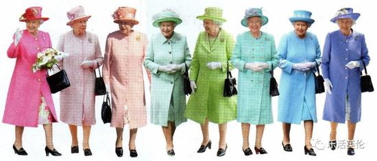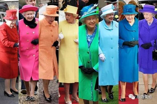 女王奶奶人送外号:“彩虹女王”,那是因为她衣柜中的衣服永远是亮色的。