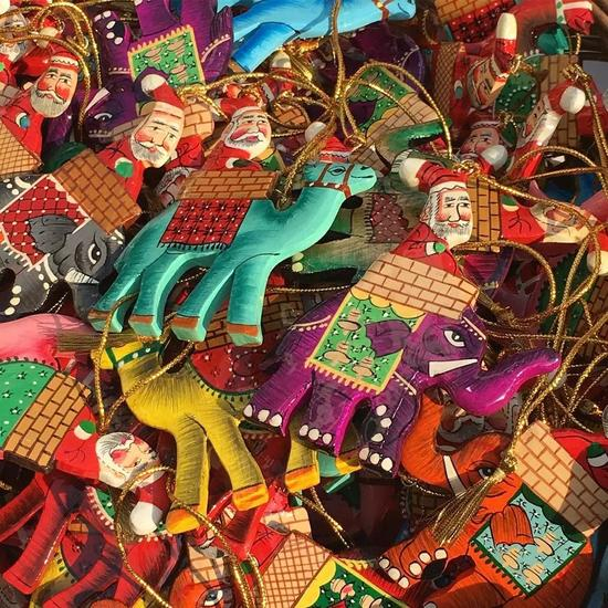 这些非常印度风格的圣诞树挂饰既可爱又萌萌的。乍一看非常拉贾斯坦邦骆驼节的风格,再一看,喔,真的是圣诞老人耶,他居然骑着大象还有骆驼。