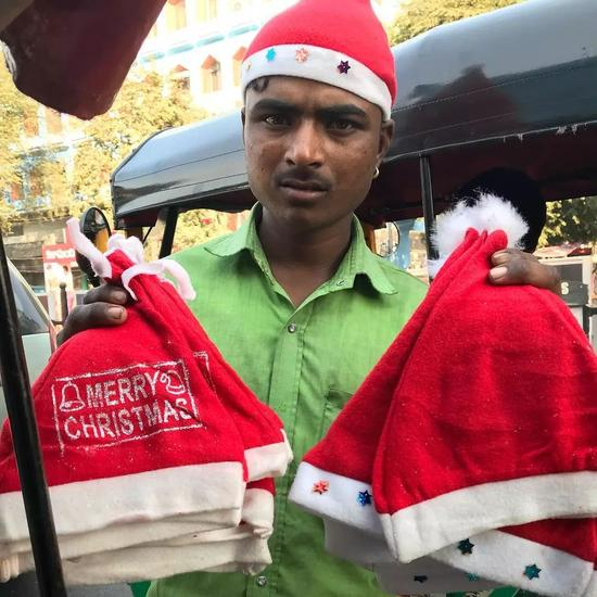 在印度的街头,有时候也会卖一些圣诞帽、圣诞袜以及一些贴画等等。