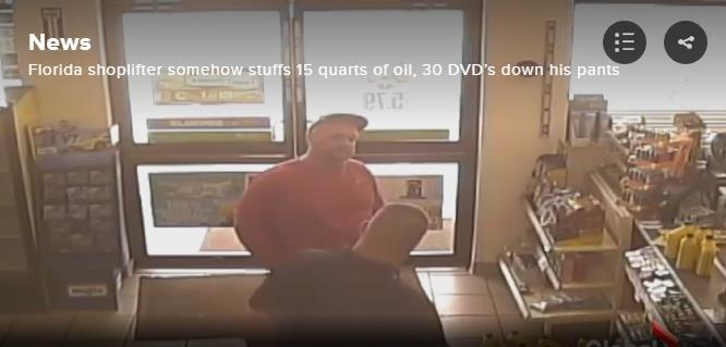 今年六月,佛罗里达州莱克兰市的一名男子,试图从7-11偷走15瓶机油和30张DVD。但是他掩盖自己偷东西的行为却很不巧妙,因为他把所有要偷走的东西都藏进了自己的裤子里。