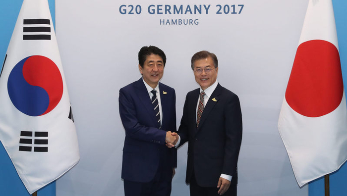 安倍与文在寅的首次双边会谈,在7月7日G20峰会期间举行。但此次汉堡会晤,却凸显了两人在慰安妇议题上的意见分歧。安倍希望不让“棘手的问题”影响两国间共同利益,要求韩方撤走设立在日本大使馆前的慰安妇少女像。文在寅则称,“大多数韩国人民无法接受”,希望日本也能考虑到韩国民众的想法。