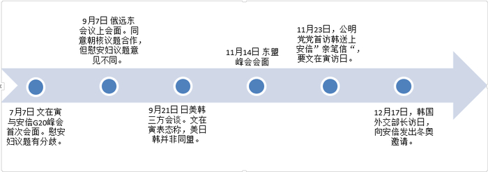 时间来到2017年11月底,日韩双方在讨论文在寅访日问题上展开了“攻心战”,其表现为双方都互相表示友好,但基本上没有实质性进展。