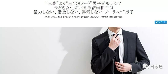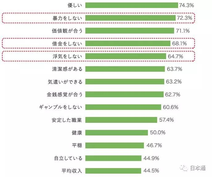 可以看出,不打人、不欠债、不外遇这三项排名非常靠前,相较于以往的“三高”标准,“三不”意味着“现代日本女性对男性的要求明显降低。