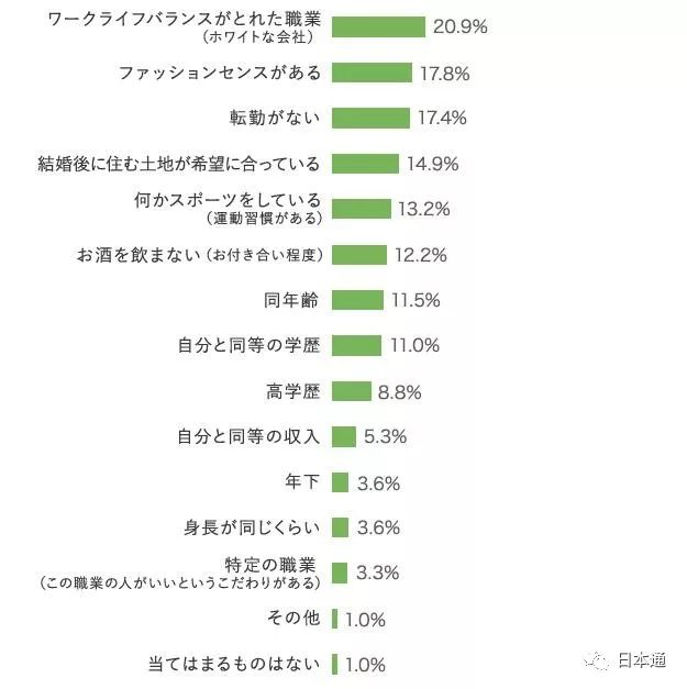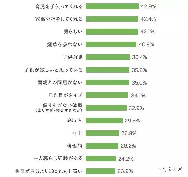 根据调查,日本适婚单身女性“最希望另一半具有的特质”前十名分别是: