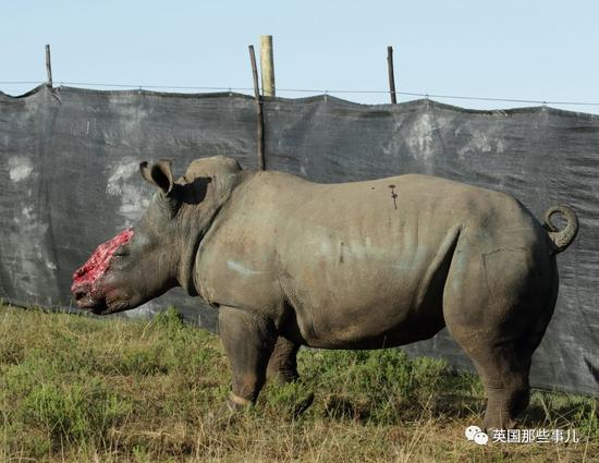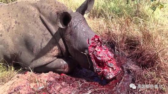 因为据说具有药用价值的角,被偷猎者用锯子连脸都锯掉的犀牛……