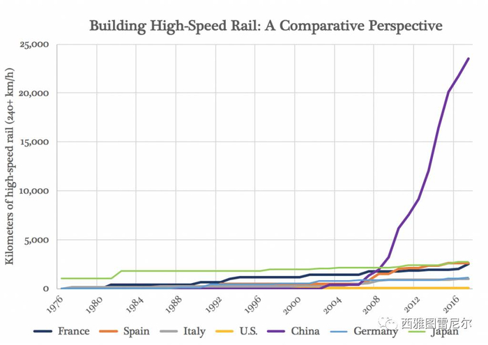 各国高铁里程数比较(美国是最底下那条黄线)