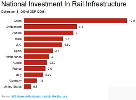 最近几十年各国对铁路投资还是非常大的。众所周知中国短短十几年之内大量投入铁路,建成高铁网络。而美国每1000美元的GDP,对铁路的投入只有0.8美元,连意大利这种国家都接近美国投入的3倍!这就是美国铁路基础设施的现状!