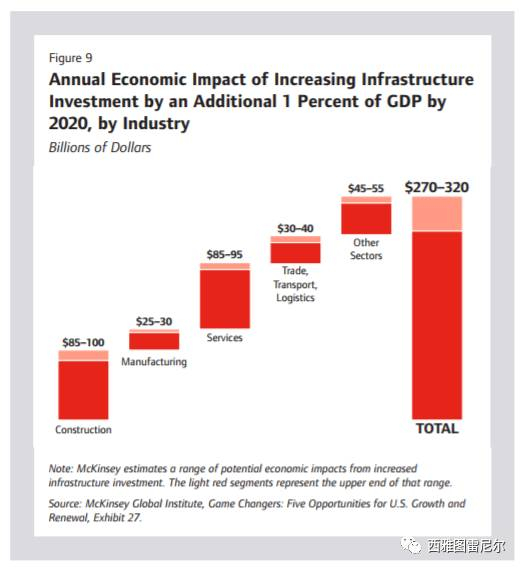 根据麦肯锡的调查报告,如果美国增加一个点的GDP的资金投入到基础设施中,会带来至少2700亿美元到3200亿美元的收益!