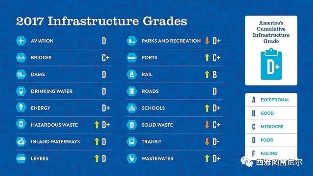 美国工程师学会对美国基建设施的打分 细分项