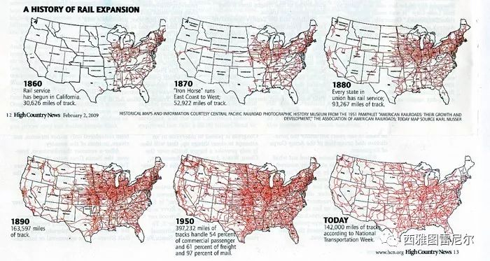 下面这个图非常清楚地展示了美国铁路建设的历史