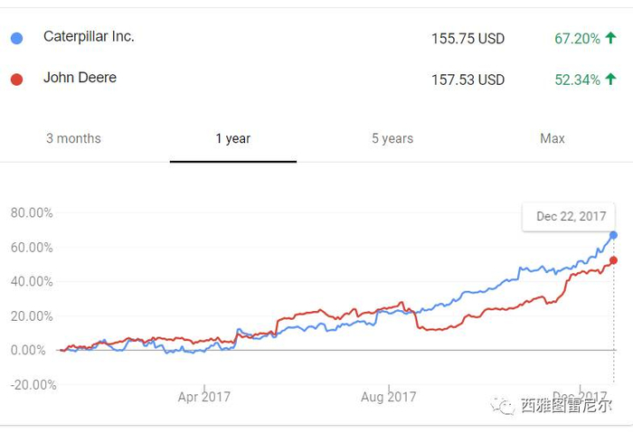 美国基建的排头兵,工程机械 Caterpillar 和John deer 一年之内分别涨了67%和52.34%