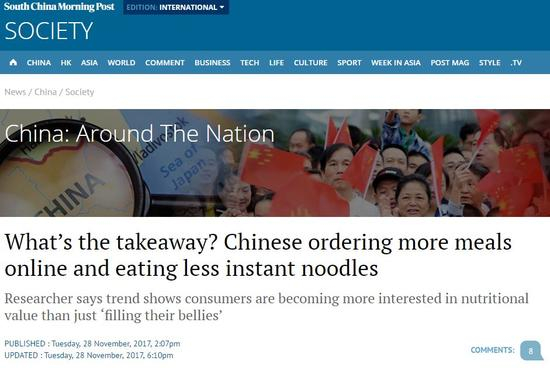 《南华早报》:外卖是什么?中国人网上点餐更多,方便面吃得更少 ——