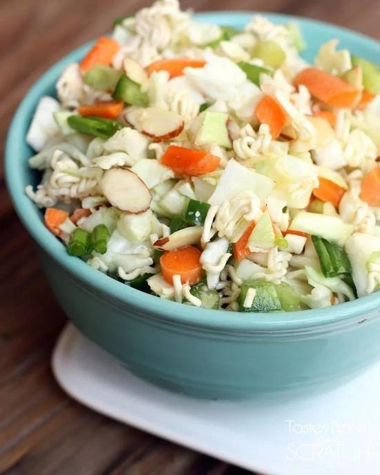 ❷Remove the seasoning packets from the ramen noodle packages and set aside for use in the dressing。 Place noodles in a large ziplock bag and crush them with a rolling pin。 Add the noodles to the bowl with the cabbage。