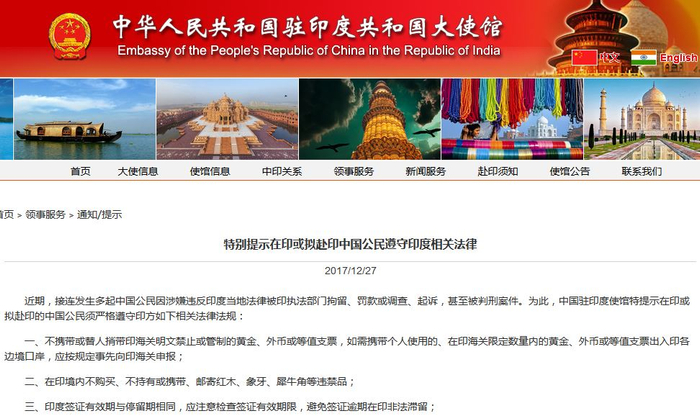27日,中国驻印度大使馆在官方网站发布提示,要求在印度或准备赴印度的中国公民遵守当地法律。提示说,近期,接连发生多起中国公民因涉嫌违反印度当地法律被印执法部门拘留、罚款或调查、起诉,甚至被判刑案件。