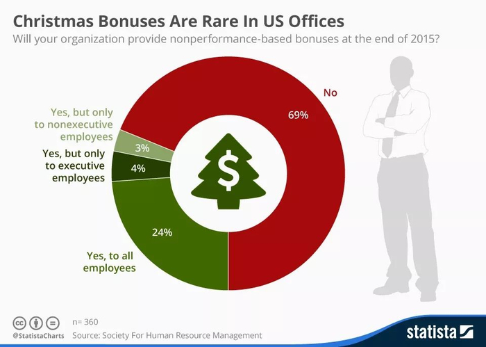 美国只有不到四成的公司会给员工发年终奖,通常在每年的12月中旬发放,也称为“圣诞奖金”。