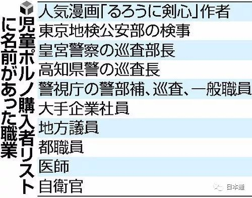 名册内除有40多岁的东京地方法院检察官、30多岁的皇宫护卫官,多名30至40岁的警视厅警员、职员,及知名企业职员外,漫画《浪客剑心》的作者和月伸宏也涉嫌购买儿童色情产品。