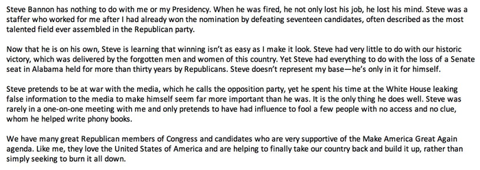 “史蒂芬·班农与我或我的总统职位毫无关系。当他被解雇时,他不仅丢了工作,也失去了理智。他是在我击败了17名其他候选人并赢得提名后才为我工作。而我的那项胜利可算得上是共和党有史以来最大的一次成功。