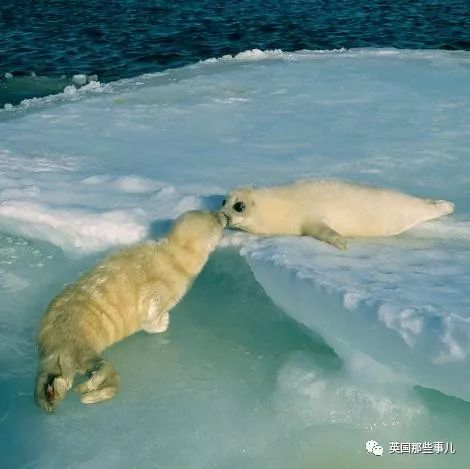 两只格陵兰海豹宝宝正在互相摩擦鼻子。