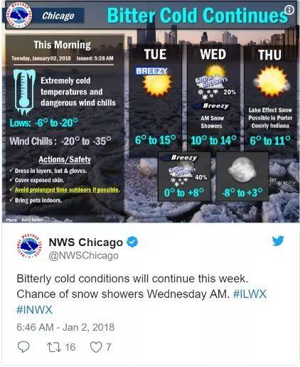 著有风城大名的芝加哥也不甘示弱。在新年的第一天,芝加哥就打破历史低温记录,全天最高温度仅为华氏1度(零下17摄氏度),并且在未来几天也是“苦寒”(Bitter Cold)。