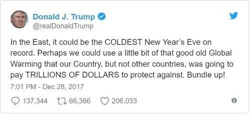 面对严寒,特朗普总统第一时间发推,调侃着说希望“温室效应”能够给现在的美国带来一点点温暖。(虽然这条推特被气象专家喷了半死)