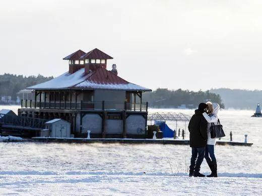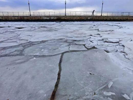 马萨诸塞州位于塔博堡(Fort Taber)公园的港口水面结起了冰。