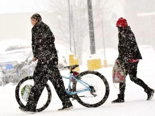 俄亥俄州大雪中推行自行车的人们。