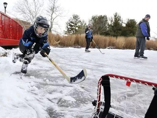 然而,低温和大雪似乎挡不住北美人民的“生活热情”,比如,在弗吉尼亚州某大学,人们在结了冰的池塘上面打冰球。(危险动作请勿模仿)