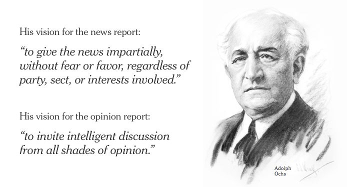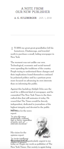 如今,我成了《纽约时报》出版人,对我来说,这个使命仿佛尤为紧迫。我们的社会再次受到政治、技术与环境力量的重塑,需要深入的审视与细致的阐释。阿道夫·奥克斯的愿景出现在这份报纸的版面上,已经是120多年的事,然而对于独立、勇敢、值得信赖的新闻报道的需求有增无减。