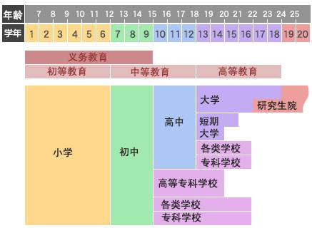 截至当年4月1日满6岁的儿童即可上小学。新学年于每年的4月开始,次年的3月结束。小学为6年制,初中为3年制。对日本国民而言,这9年是义务教育。对外国人而言,虽然不是义务教育,但可以根据自己的意愿进入地区的公立小学和初中就学在一些公立小学·初中·高中还开设专门面向外国人和归国子女的班级制度,若有需要可以向居住地政府咨询。