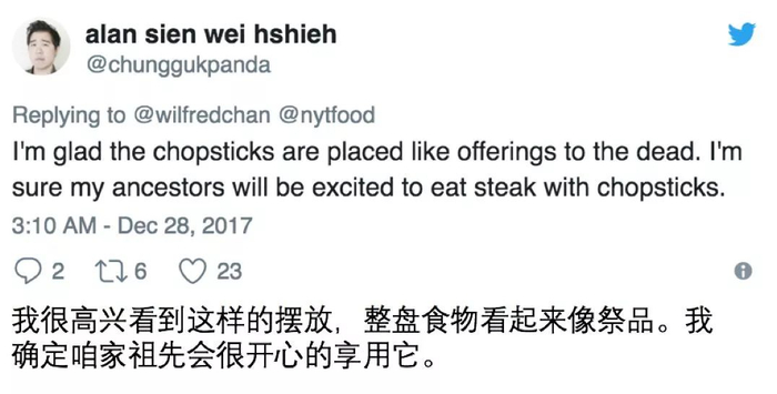 这么重视咱中餐,点赞。想说中西方文化融合的概念是挺不错,可米叔仔细看着图中的筷子摆放位置,这不是祭品的摆盘吗。这放到咱家,长辈早急眼了。纽约时报居然会犯这样的错误?