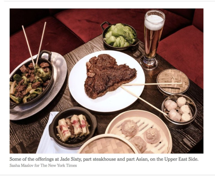 例如前几天,纽约时报为一家即将开张的中餐馆做宣传,为了突出“东方文化”和美感,美食造型师将筷子斜着插入菜品中,将筷子与西方牛排插在一起摆拍,希望表达中西方的融合。