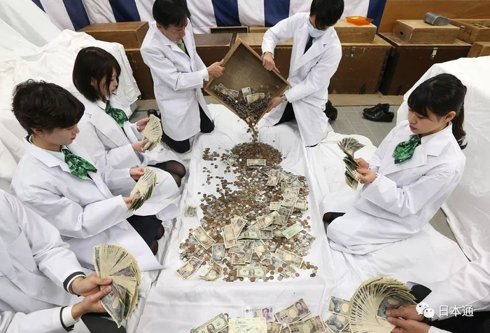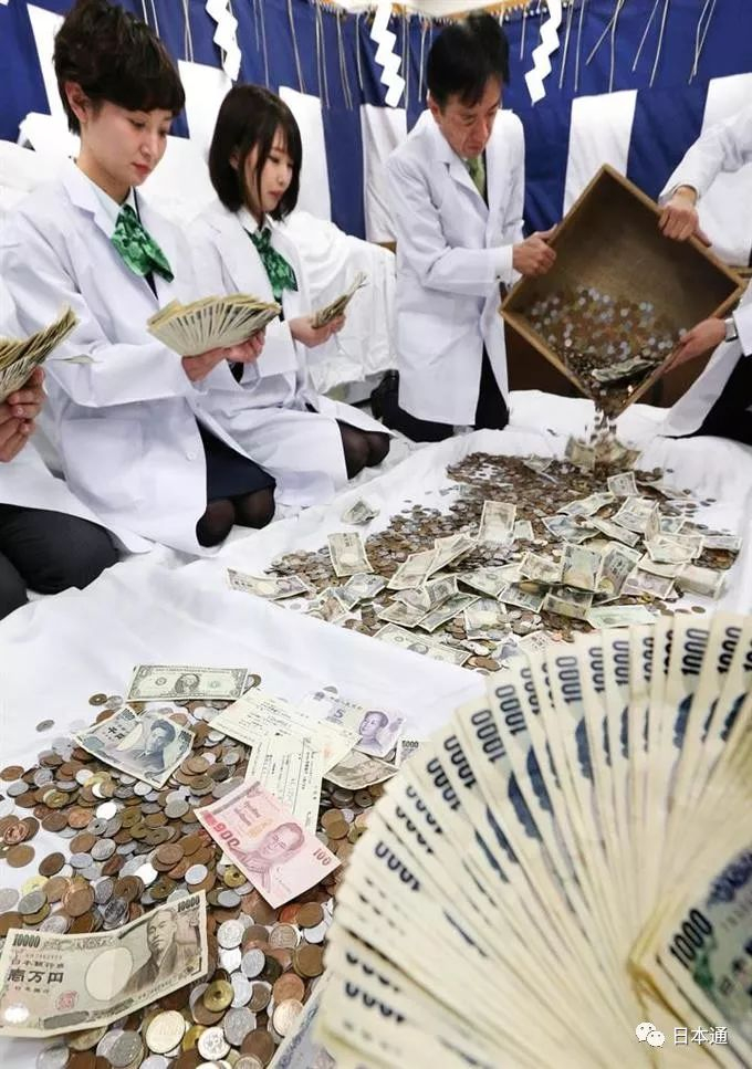 从神社境内约50个地点收集而来的香油钱,在神社事务所的工作台上铺开后,来自银行的8名专业人士身穿白衣开始熟练地清点。由于金额巨大,整个统计过程会持续5天。