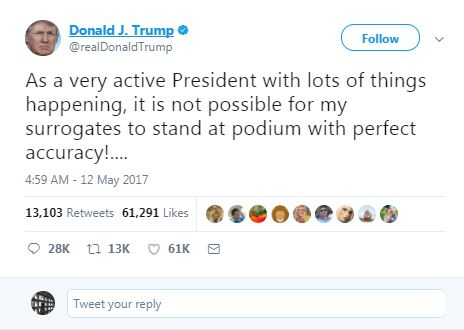 特朗普经常把“忙碌”挂在嘴边。他在推文中会提到自己“是一位要处理诸多事务的总统“,因此新闻发言人难免犯事实性错误。白宫发言人也常向记者表示,“总统一天要出席多个会议,与多人通话”,而特朗普也曾在空军一号中对采访记者表示,“忙于阅读各类文件”。