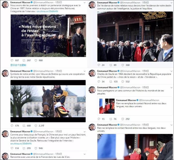 仅仅一天时间,马克龙就在个人推特上更新31条帖文,在脸书上更新9条帖文,分享西安之行的震撼感受。