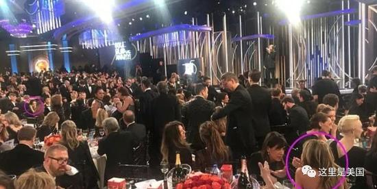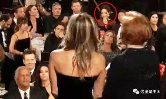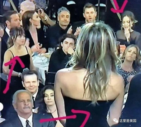 这张照片迅速火了,《五十度灰》女主达科塔•约翰逊(左箭头)的表情亮了,所有吃瓜群众的八卦之魂也熊熊燃烧起来:谁不想看朱莉(右箭头)对安妮斯顿(台上背影)的反应???
