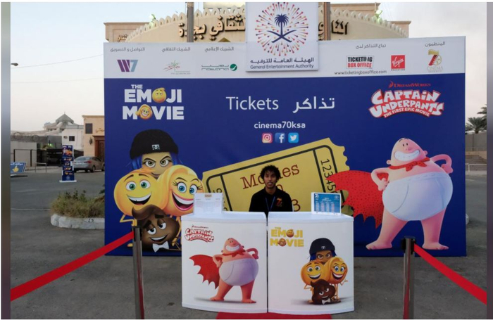 沙特阿拉终于打破了35年来的电影禁止公映禁令!开始在红海海滨城市吉达的一间临时改造的文化宫放映好莱坞动画电影《表情奇幻冒险》。