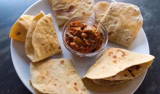 在新德里大街小巷都可以见到的一种面饼,用小麦粉、盐和水混合烙制而成,通常搭配咖喱和各种酱料食用。