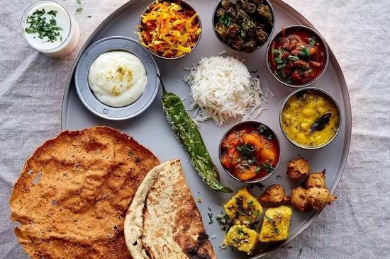 印度最传统、最常见的套餐,是将小份的米饭、面饼、酸奶、咖喱、蔬菜、甜点等放在圆形铝盘中,象征着苦、涩、辣、酸、咸、甜六味的均衡。