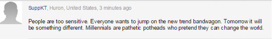 大家都太敏感了吧。每个人都想跑来蹭个热点。千禧一代真可悲,总是装作一幅可以改变世界的样子。