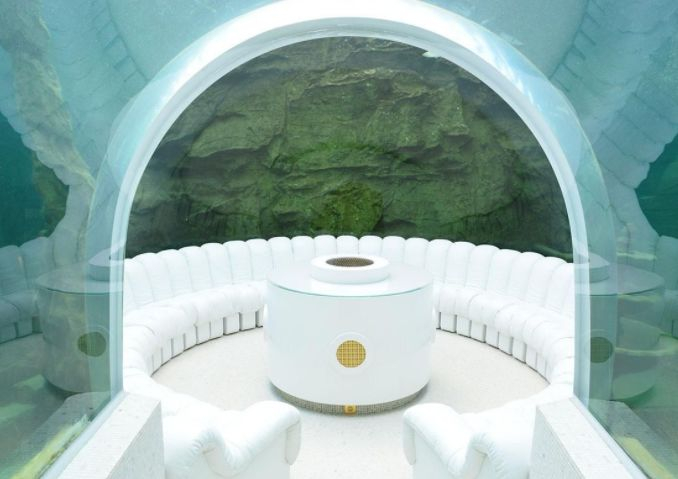 鲟鱼环绕下的冥想室在城堡的护城河底部,有一间壮观的水下冥想室。整个冥想室被包裹在一个巨大的水族箱内,人们可以从游泳池进入,室内环绕着一圈皮质沙发。坐在舒适的沙发上,可以宁静地注视四周优哉游哉的鲟鱼和鲤鱼。