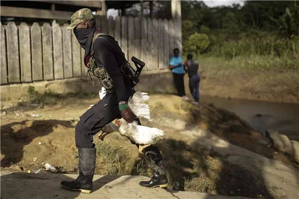 在这个村落里,我们开始陆陆续续见到“民族解放军”成员的身影。他们身着迷彩服,大多戴着红黑两色印有“ELN”(民族解放军西班牙语首字母缩写)字样的面巾和帽子。