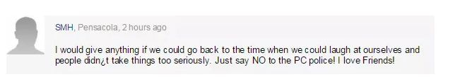 我真的愿意放弃一切让我自己回到那个时代,我可以笑自己,笑别人,不用担心其他人太较真。我只想对这些道德警察说“不”,我爱《老友记》