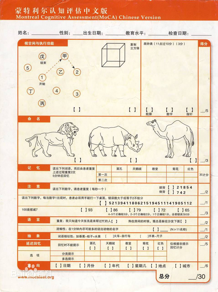 该测试总分为30分,超过26分即为正常,22分为由轻微的认知障碍,16分则意味着患者有帕金森综合症或阿茲海默症。